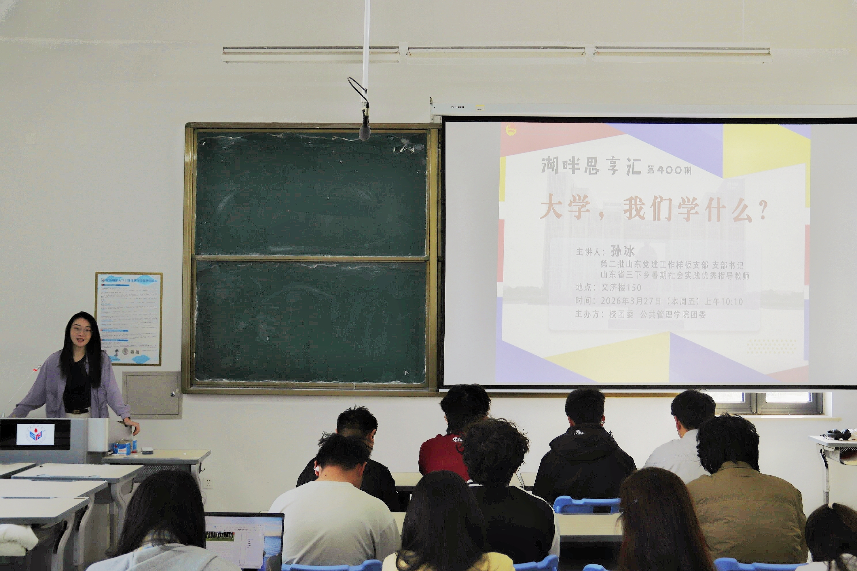3月27日,学院于长清湖校区文济楼举办“大学,我们学什么?”湖畔思享汇。学院团委教师孙冰担任主讲人,2025级全体本科生参加。