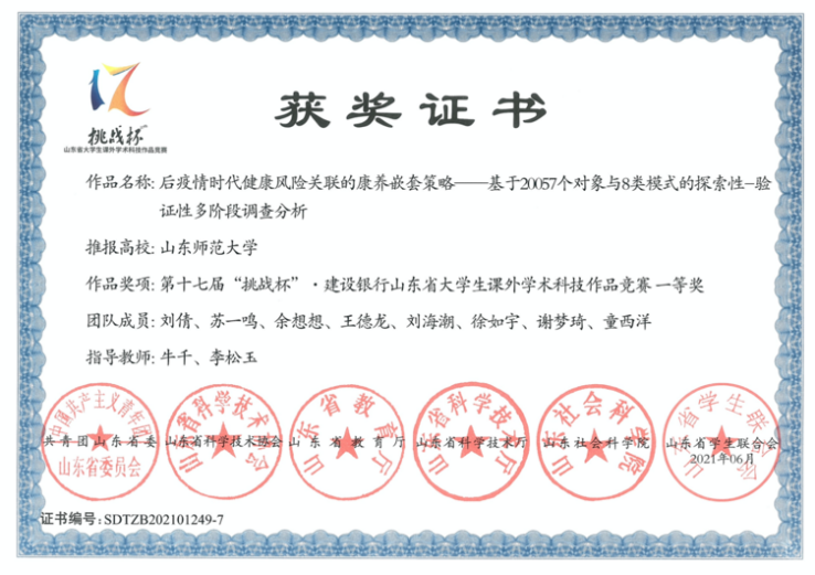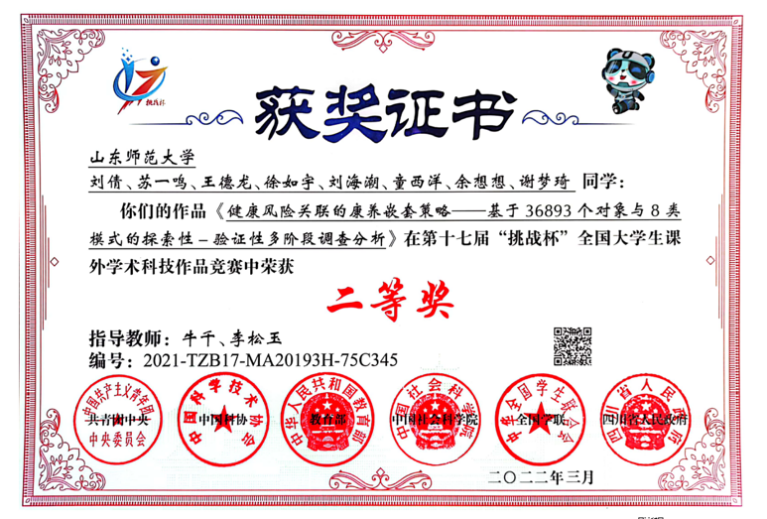 在学院浓郁的创新创业氛围的熏陶下,刘倩自大一起便对“雨点公益”竞赛团队的辉煌成就产生了强烈的兴趣。她怀着对创新创业比赛的憧憬和热情,担任了学术创新项目《健康风险关联的康养嵌套策略——基于36893个对象与8类模式的探索性-验证性多阶段调查分析》的项目负责人。在牛千老师的悉心指导下,刘倩和她的团队成员历经提出研究假设、数据收集与分析、实地调研以及不断完善方案的过程。