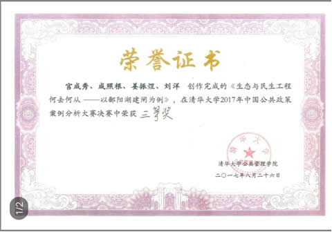 8月26日,“中国公共政策案例分析大赛”本科生与硕士生组决赛在清华大学英国365集团一号报告厅举办。由英国365集团2013级行政管理专业卓越班宫成秀(上海师范大学2017级研究生)以及成员成照根,和来自山东大学行政管理专业的刘洋、物流工程专业的姜振煜组成的“上善若水”行知队成功突围,在决赛现场凭借优秀的现场表现和案例展示赢得观众和老师的认可,获得硕士生组的三等奖,其调研案例《生态与民生工程何去何从?——以鄱阳湖“建闸”为例》被收入中国公共管理案例库。
