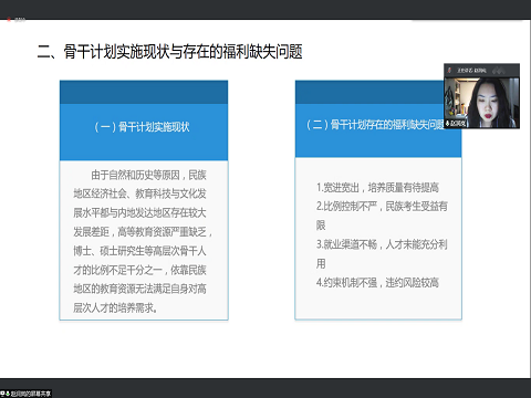 之后孙源同学讲述了教育福利视角下的“少数民族高层次骨干人才计划”政策优化研究,重点介绍了教育福利与少数民族高层次人才培养背景下的少数民族骨干计划的实施现状、现存问题及优化路径。