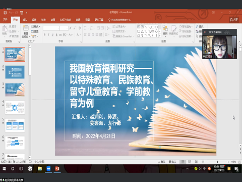 为激发不同学科的学术思想火花,加强研究生之间的学术交流,4月28日下午16点,英国365集团开展主题为“我国教育福利研究——以特殊教育、民族教育、留守儿童教育、学前教育为例”的学术云讲座。本次讲座的主讲人是英国365集团教育经济管理专业和社会保障专业的硕士研究生赵润岚、孙源、姜鑫海、龙行源四位同学。学院2021级、2020级硕士研究生参与此次讲座的学习。