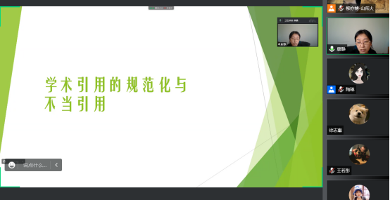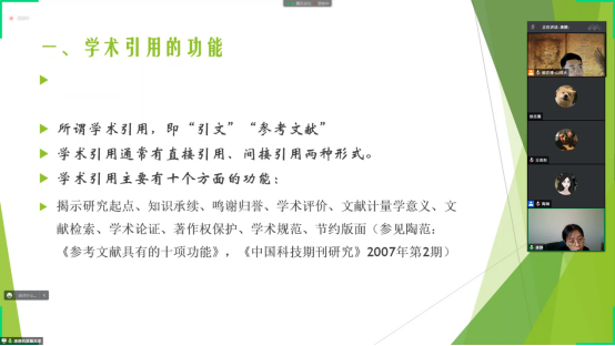 再次,唐静老师针对学术引用的功能展开了详细的讲解。唐老师先是指出,所谓学术引用,也就是“引文”、“参考文献”,其通常有直接引用和间接引用两种形式。随即,唐老师借陶范发表在《中国科技期刊研究》的一篇文章,即《参考文献具有的十项功能》,介绍了学术引用的十个功能。第一,揭示研究起点。唐老师表示,参考文献的检索范围和阅读选择决定了研究者的研究方向和选题,任何的研究都是在一定的学术脉络中进行的,都要借鉴他人的工作和研究成果,我们需要通过学术引用来了解问题研究的进度和深度,以及是否有进一步的研究空间,因而参考文献就构成了学术写作的一个起点。第二,知识承续,即学术引用是对知识体系的积累和传承。第三,鸣谢归誉,也就是说,规范化的学术引用表现了引用者对被引用者著作成果的尊重。第四,学术评价。唐老师强调,这是非常重要且多方面的一个功能。学术引用对于被引用者而言,能够对他的学术影响力做出评价,对于引用者而言,参考文献能够体现文章的学术创新性和可靠性,同时无论是对于编辑还是期刊来说,都是一个重要的评价指标。第五,文献计量学意义。唐老师指出,这一功能较不常见,我们可以通过参考文献的引用分析预测某一学科的影响和重要性,以及预测某一研究方向的发展前景。第六,文献检索,即参考文献能够作为一个重要的线索,读者可以借此由点及线到面,对相关研究有一个大致的、较为全面的了解。第七,学术论证,这是最核心、最基本的功能。第八,著作权保护。唐老师表示,不论是对被引用者还是引用者而言,这都是某一种程度上的保护,并且期刊编辑也可以较为准确地区分现作者和原作者学术成果的不同之处,以避免出版过程中的疏漏和错误。第九,学术规范。这一功能主要是从个人角度来进行论述的,能够体现出作者个人的治学态度,从而有利于学术生态的建构。第十,节约版面。唐老师将论文写作比作一棵大树,论文内容如果枝丫太多、主干不能凸显出来就会降低作者的逻辑表达和读者的阅读感受,因而我们可以灵活运用参考文献,在注释中进行一些补充说明,这一方面能够节约版面,另一方面能够服务于作者论证和思想的表达,使文章结构更加紧凑和精炼。