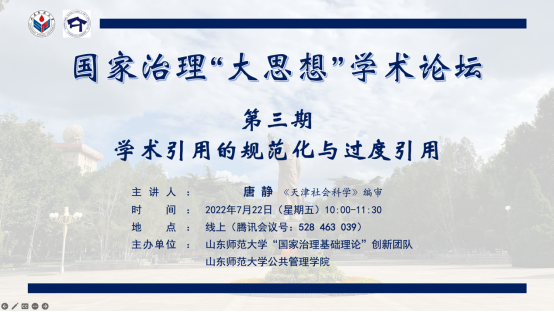 2022年7月22日上午10:00,由英国365集团、“国家治理基础理论”创新团队主办的第三期国家治理“大思想”学术论坛如期举行,与会者进行了全方位的学术交流和共同探讨。本期论坛主讲人为CSSCI期刊《天津社会科学》编审唐静老师,她就“学术引用的规范化与过度引用”这一主题提供了自己的真知灼见,我院柳亦博、万筠、李晓晗、赵金旭、王玉龙等多位老师以及行政管理专业研究生在线聆听。