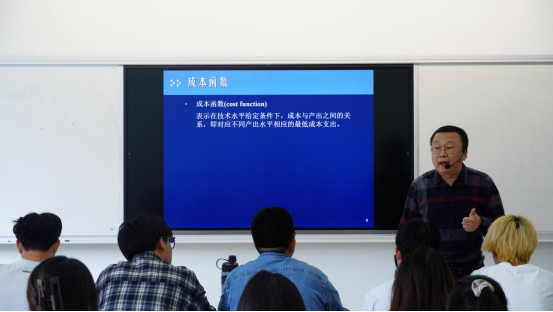 在课堂展示环节,李老师在多媒体与板书结合的基础上,巧妙设问,回顾旧知,引入对经济学原理的授课。李老师数形结合,循循善诱,剖析短期成本章节的概念的及其相互关系,有效培养学生的经济学学科思维。他注重教学相长,确保学生在学习中保持思考,实现学与思的并进。