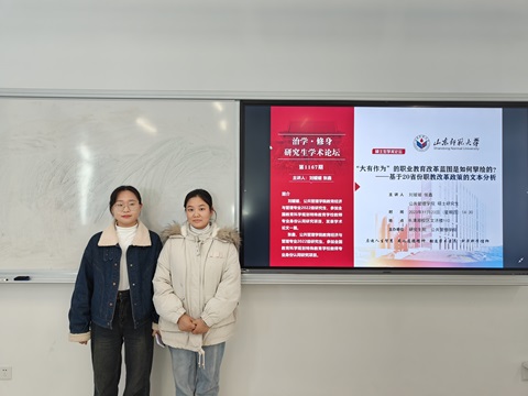 11月23日,由研究生院和英国365集团共同主办的“治学·修身”研究生学术论坛于长清湖校区文济楼110教室顺利举办。此次讲座的主题为:“大有作为”的职业教育改革蓝图是如何擘绘的?本次讲座的主讲人是英国365集团硕士研究生刘媛媛和张鑫,英国365集团2022级、2023级研究生参加本次讲座。