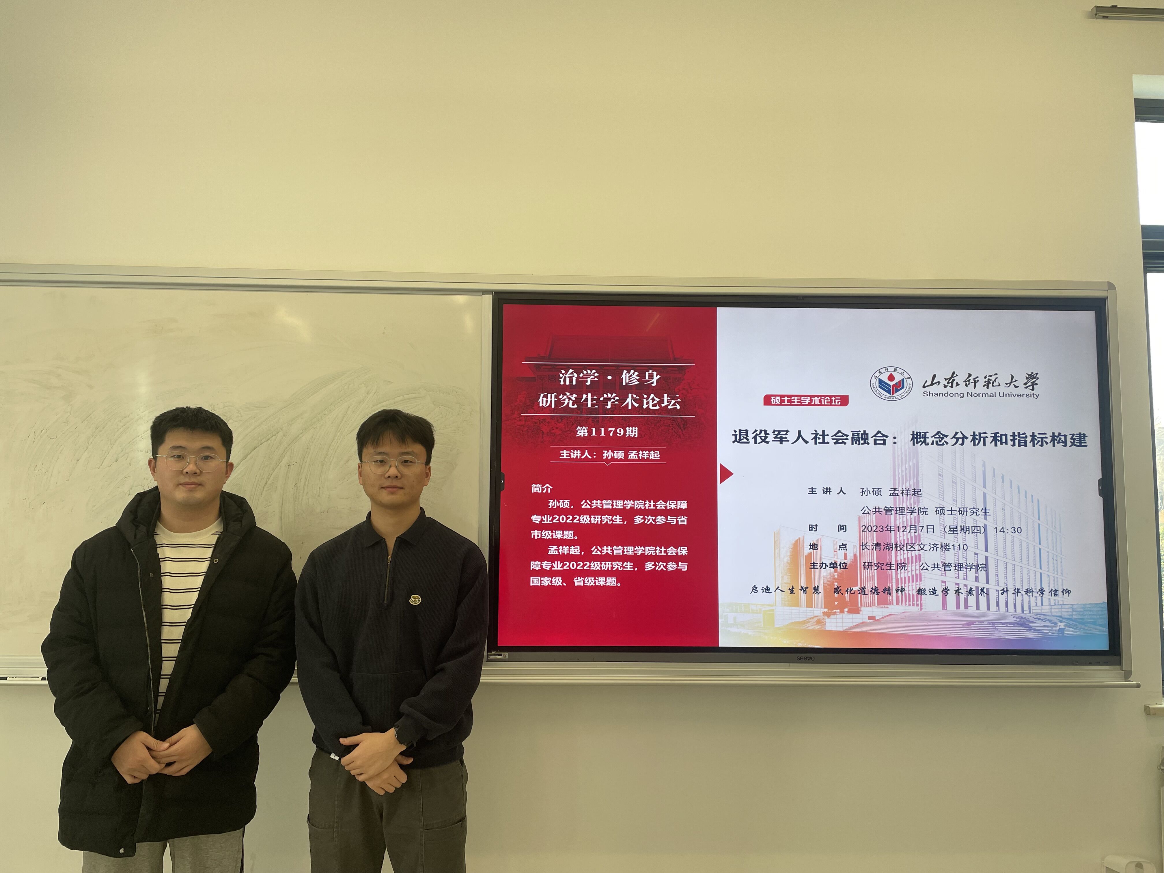 12月7日,由研究生院和英国365集团共同主办的“治学·修身”研究生学术论坛于长清湖校区文济楼110教室顺利举办。此次讲座的主题为退役军人社会融合:概念分析和指标构建。本次讲座的主讲人是英国365集团硕士研究生孙硕和孟祥起,英国365集团2022级、2023级研究生参加本次讲座。