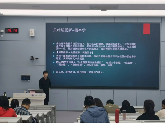 讲座伊始,于江波主任分享了自己与周易的结缘之路,指出它深刻揭示了宇宙间变化的规律,倡导人们追求内外和谐,培养勇往直前、恒心耐力与和平协调的品质。随后,他梳理了近代著名学者对周易的看法,强调了周易在国人心目中的特殊地位以及其在日常生活中的广泛应用。讲座的高潮部分,于江波主任详细解读了周易的八种思维,并结合个人为人处世的生活哲学进行了深入剖析。他通过生动的事例,深入浅出地阐述了传统哲学思维在现代职场中的实际应用,引发了同学们的深思。