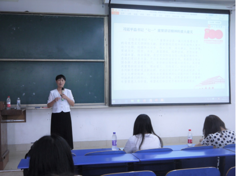 活动伊始,万金凤首先从习近平总书记七一重要讲话精神的重大意义谈起,并对七一重要讲话精神的新思想新观点新论断进行了阐释。接着她从“深刻把握‘一个主题'和‘四个伟大成就',锚定前进方向”“传承伟大建党精神,汲取强大前进力量”“奋进新时代,走好新征程,做更好的自己”三个部分系统展开,并结合党史学习、爱国主义教育、理想信念教育和中国共产党人精神谱系以及自己学习成长经验等和大家分享了心得与体会。此外,她还向同学们提出了三点要求:第一,立大志、明大德,找准自己前进方向;第二,担大任、成大才,练好“内功”谋发展;第三,强信心、培兴趣,坚持就能赢得胜利。最后,活动在师生们齐诵“请党放心、强国有我、强国有我、未来可期”的誓词中圆满落幕。