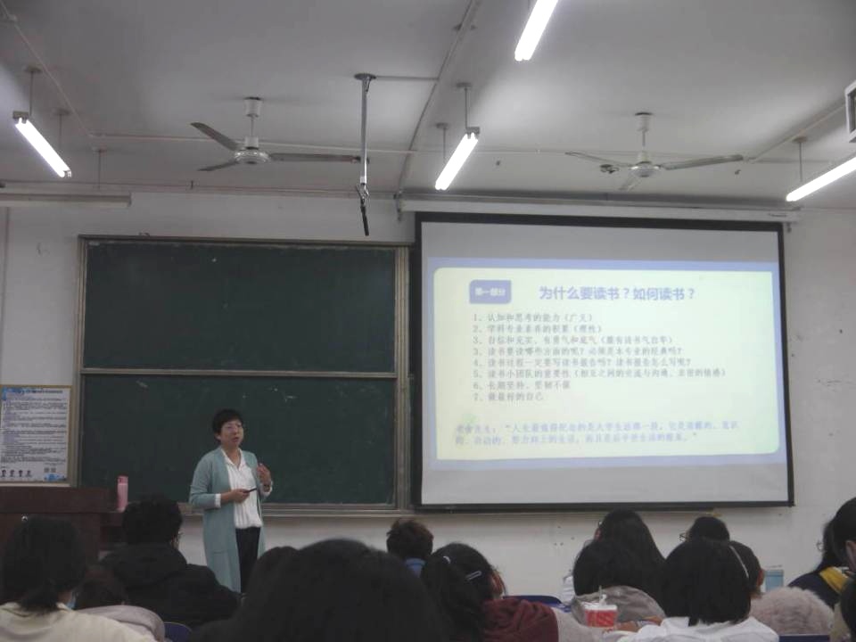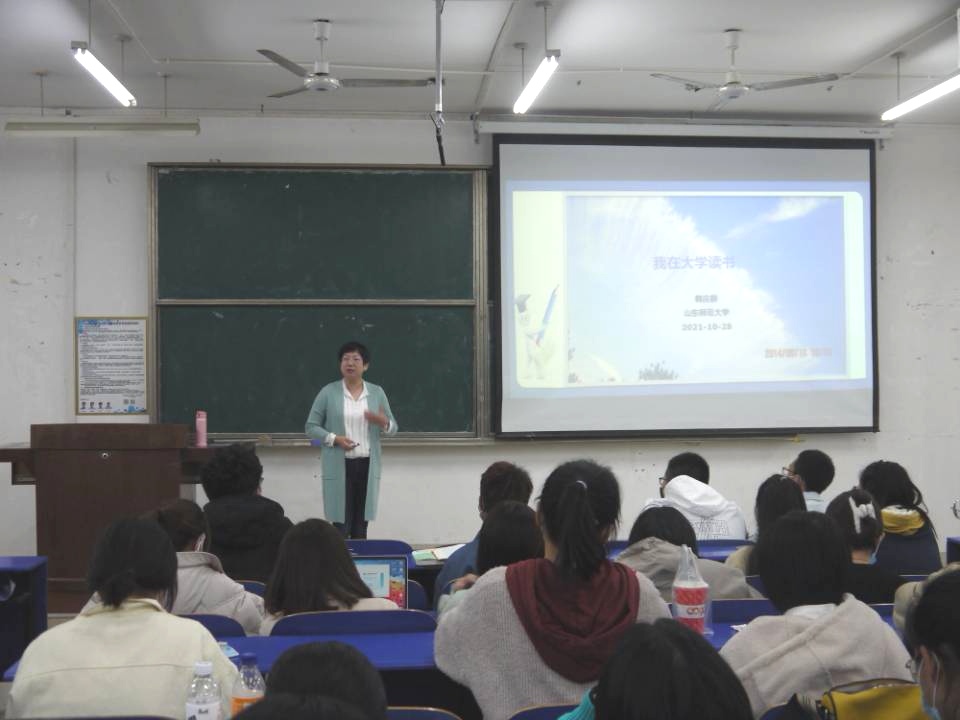 讲座伊始,韩庆龄进行了自我介绍,并简单介绍本次讲座的目的。韩庆龄从三个方面介绍了讲座的主要内容,她首先向同学们强调“知行合一”的重要意义,并通过列举中国传统文化中的留白以及还原社会现象的案例,阐述了学以致用的必要性。其次,她从“培育素养”、“增添底气”、“稳定心态”等方面讲述读书的重要作用,针对“书籍文章的选择”、“读书报告的撰写”、“读书团队的交流”等方面内容为同学们开展读书活动进行指导。接着,韩庆龄结合自身经验与他人实践经验强调行动的不可或缺性,提出同学们应关注现实,培养从生活现象中发现并反思社会问题的能力,她希望同学们在积累一定读书经验的基础上,积极探索、发现社会问题,参与社会实践活动,丰富对生活的认知。讲座结束之际,她激励刚刚踏入大学校门的同学们在今后的学习生活中始终保持初心,阳光纯粹,努力前行。至此,本次讲座圆满结束。