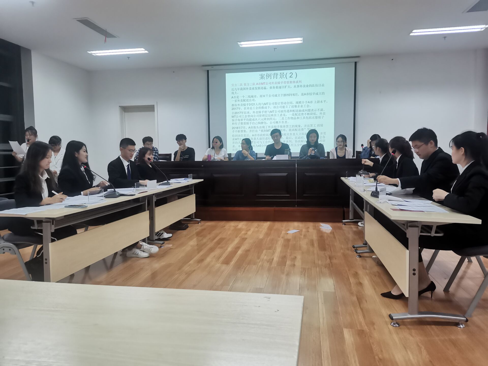 比赛共有14名选手参加,选手四人一组,分为劳方和资方进行模拟谈判。劳资双方分别提出自己的利益主张,就劳动报酬、工作时间、劳动与安全等有关事项进行平等协商。比赛一共分两场进行,每场比赛结束评委老师进行点评并针对性地给出指导意见。