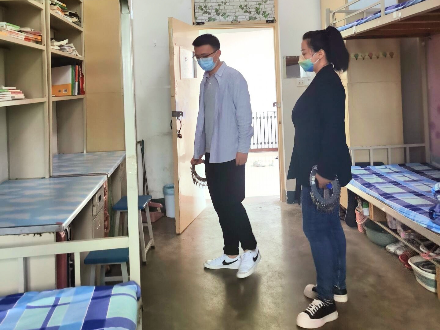 老师们针对宿舍衣物悬挂不齐、床铺不平、被子叠放不合格等问题建议同学们要勤通风,保持地面整洁,养成勤于整理内务的好习惯,以营造一个整洁干净的宿舍环境。老师们还对床帘悬挂及收纳情况进行了检查,希望同学们进一步增强宿舍安全意识,严格遵守学校安全管理规章制度,提高自我管理能力,营造安全文明的宿舍环境。针对用电安全,老师们再次强调严禁在宿舍使用违规电器,杜绝宿舍内无人时用电情况出现,及时整改目前存在的消防隐患;针对防疫安全,老师们要求学生继续落实晨午检制度,每日进行疫情防控打卡,提高应急处置能力,戴口罩、勤洗手,提高防疫意识。