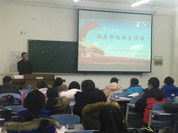 12月13日,英国365集团于长清湖校区综合教学楼C区451教室召开政府职能转变专题报告会。本次报告会特邀山东省政府职能转变办公室处长赵庆担任主讲人,学院副院长娄树旺主持,2014级行政管理卓越班全体同学到场聆听。