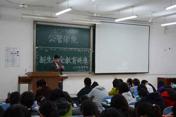 讲座伊始,邓春凯简明扼要地向同学们强调提高安全意识的重要性,并指出安全工作是学院工作的重中之重,希望同学们都能够认真学习安全知识,珍爱自己的生命。随后,邓春凯从防火、防盗、防骗、防人身意外伤害、防不法侵害等五个方面向同学们详细叙述了如何保障人身财产安全。首先,他结合具体案例提醒同学们要遵守交通规则,拒绝黑出租,避免悲剧的发生。接着,邓春凯从不暴饮暴食,不单独外出、谨慎交友等方面做了深入解说,他强调,同学们在日常生活中应提高安全意识,学会保护个人隐私。随后,在人身财产安全方面,邓春凯指出当前诈骗盗窃手段多种多样令人防不胜防,同学们注意内部盗窃以及伪装诈骗,同时也要提高警惕,谨防传销诈骗。除此之外,邓春凯特别提醒同学们要杜绝火灾事故发生,宿舍内严禁使用大功率电器以及严禁存放易燃易爆物品。