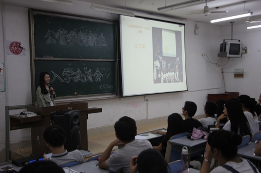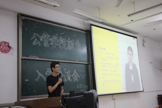 会议伊始,白玉坤首先向同学们介绍了公共管理专业及其就业方向与前景。其次,白玉坤就专业分流、自主选择专业、个人荣誉三个方面对学校部分规章制度做了阐释。随后,白玉坤就学生会的得与失、兴趣培养等方面向同学们在生活方面提出建议,希望同学们有一个丰富多彩的大学生活。接着,由来自2015级的四位优秀学生代表依次与同学们分享宝贵的学习的经验,分别就具体学科的学习提供了不同的建议。2015级学生代表在讲述他们学习方法的同时也告诉新生应该怎样把自己的大学生活过得多姿多彩,怎样规划好学习时间,如何确立自身目标,以及如何做好大学四年的规划。在接下来的互动环节里,大一新生结合自己的实际情况进行了提问,学生代表依次为他们答疑解惑,整个交流会气氛轻松愉快。