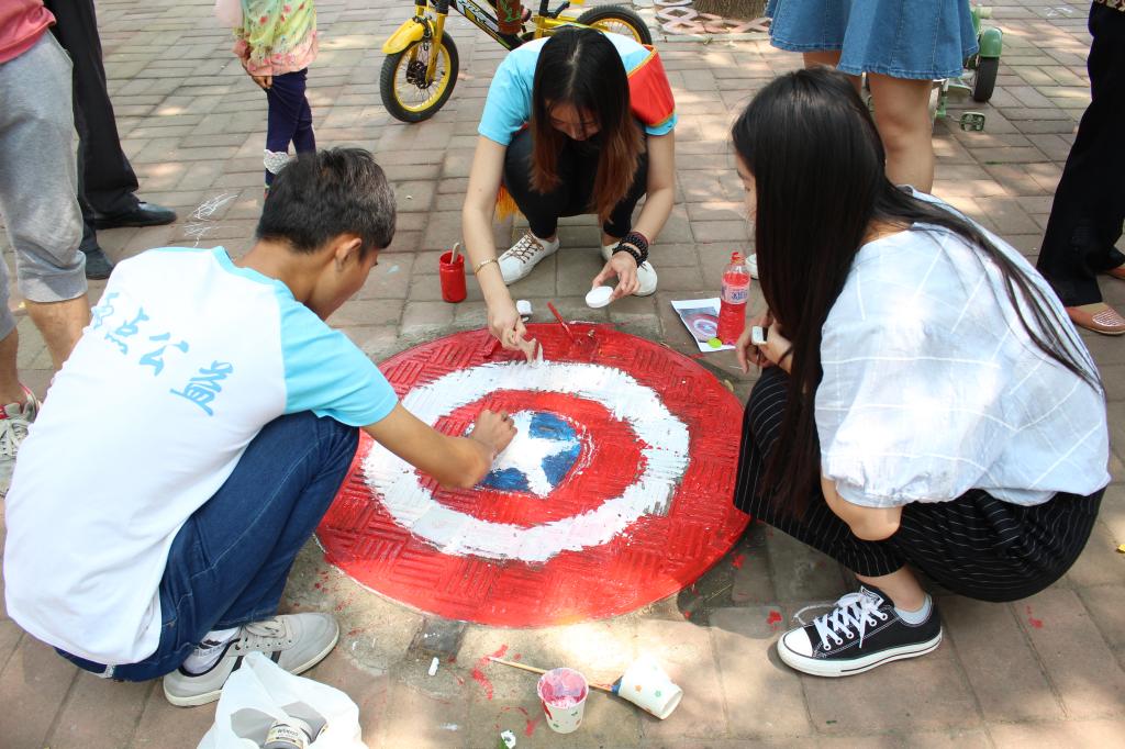 上午八点,志愿者们乘车到达王官庄街道九区社区,社区负责人对志愿者们的到来表示热烈的欢迎并帮助他们安排好志愿服务的工作。在前期的准备活动中,志愿者们对图案构思、颜色布局、井盖分配等相关问题进行了交流探讨,为活动的顺利开展打下了良好基础。随后,活动负责人将参与活动的社区小朋友分成四组并分配绘画材料,在志愿者们的陪同下小朋友们开始了有趣的井盖涂鸦活动。活动过程中,志愿者们大展身手、各显神通——史迪仔、多啦A梦、海绵宝宝等卡通人物的绘制使孩子们重温了童年时光,各种美食图案让人口水直流......社区居民纷纷驻足观看,更有叔叔阿姨们主动帮助,与志愿者们一起绘出童年风采。活动过后,社区领导表示了对此次活动的支持并代表社区居民对学生的到来表示感谢,志愿者们也表示通过本次活动给孩子们带来了更多的乐趣,同时丰富了自己的社会实践经验。最后,社区负责人与志愿者们进行拍照留念。
