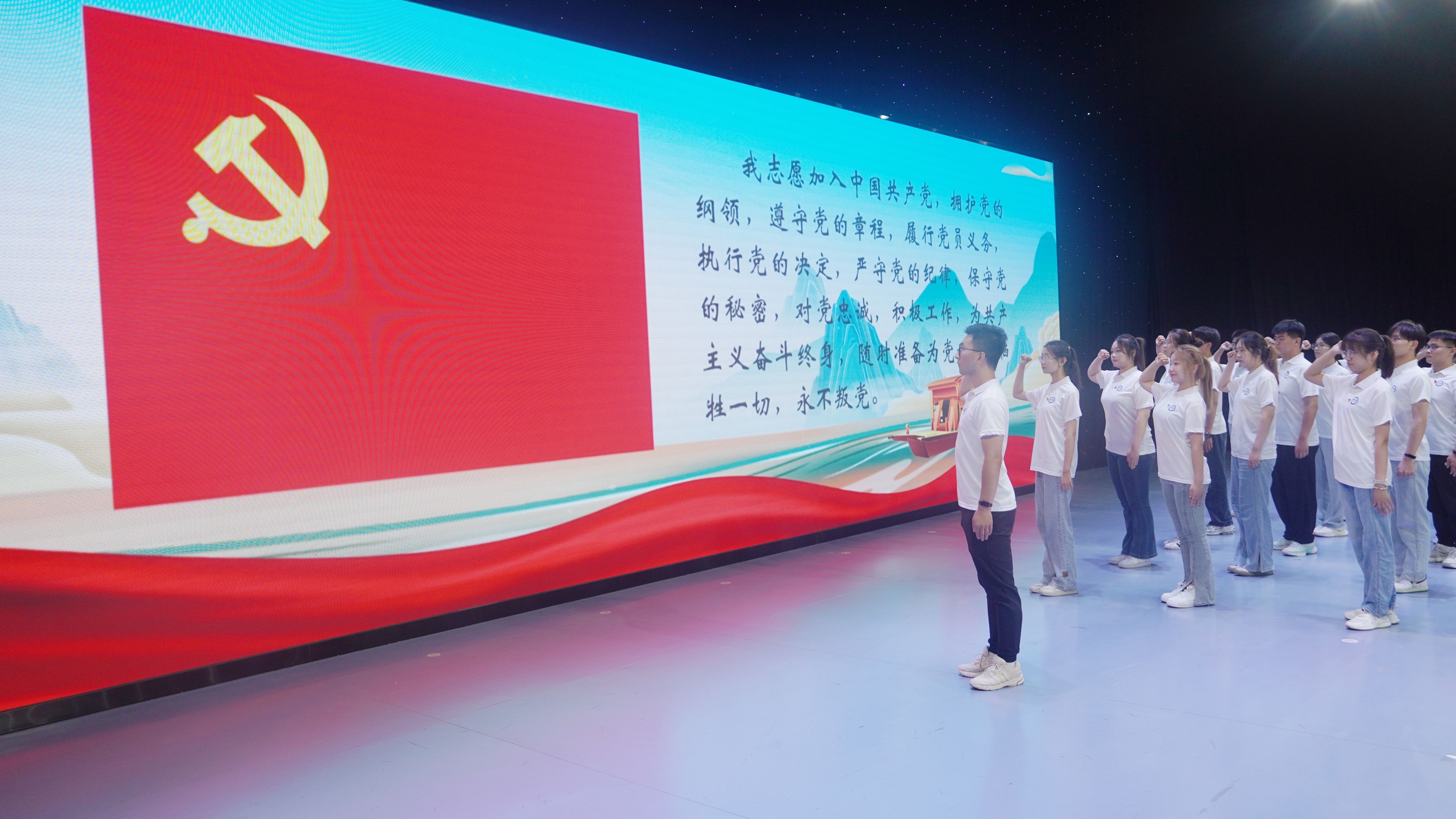 学院2023年度新发展的预备党员和转正的党员上台宣誓,现场全体党员重温入党誓词。
