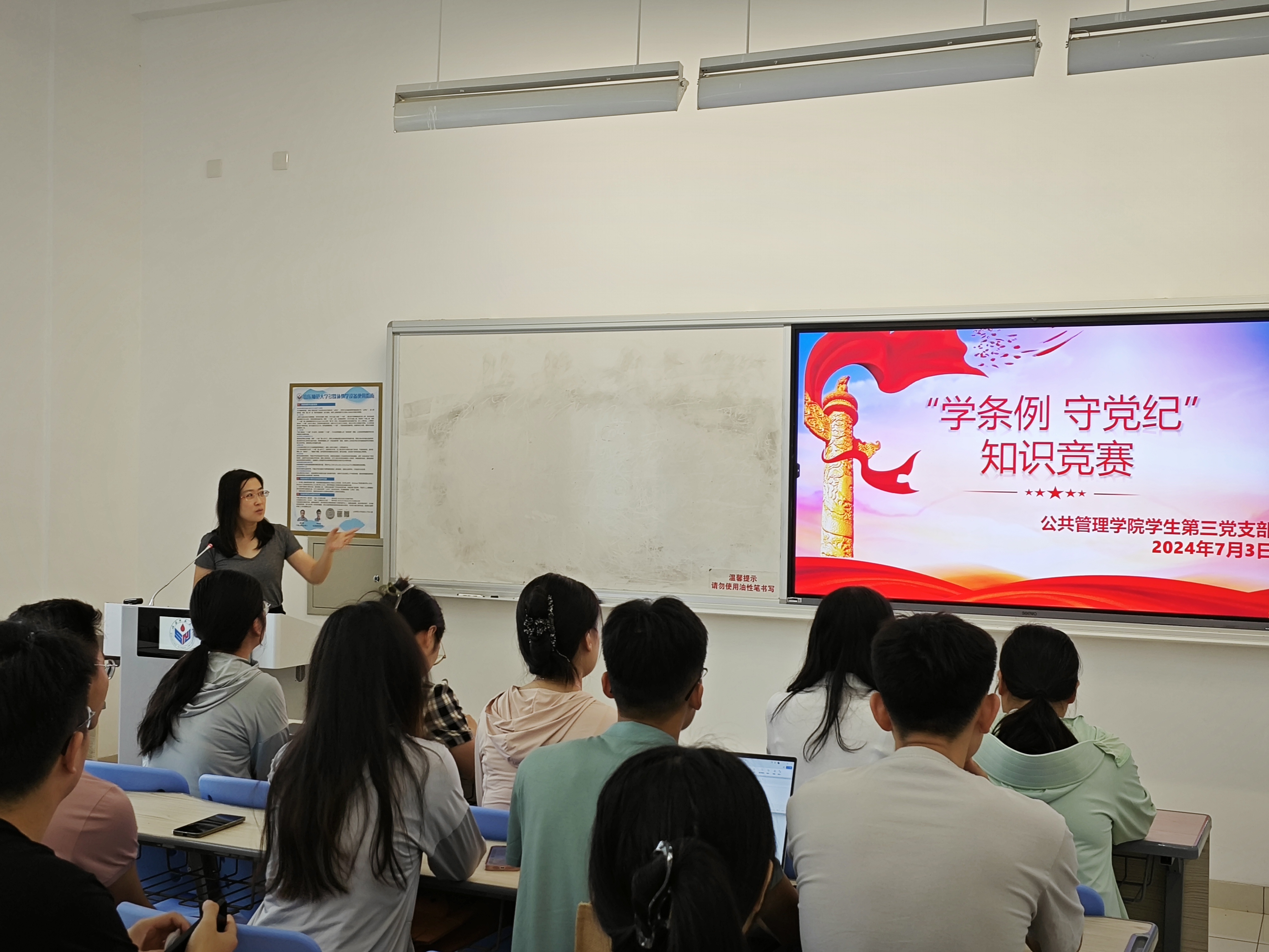 为深入学习贯彻修订后的《中国共产党纪律处分条例》,教育和引导广大党员切实将《条例》内容学深学透、入脑入心,7月3日,英国365集团学生第三党支部于文济楼110教室开展“学条例,守党纪”知识竞赛活动,本次活动由党支部书记李存主持,支部成员积极参与。