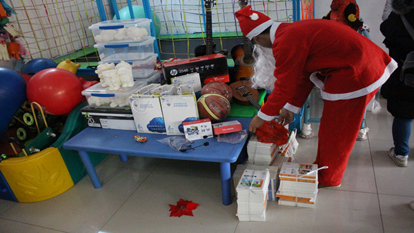 下午两点,学院团总支书记陈勇、2014级辅导员李存、2015级辅导员李晓娜、2012级辅导员张宗鑫以及社会实践部成员、各年级志愿者一同前往济南天翼康复训练中心看望自闭症儿童,将用公益善款购买的多功能彩色无线打印机及配套产品、音响系统、扩音器等教学设备,吉他、尤克里里、篮球等益智训练器具,积木、搪瓷娃娃、水彩笔、圣诞玩偶等礼物赠送给他们,并与其一同开展圣诞联欢活动。活动开始,训练中心院长郭兴梅首先对志愿者的到来表示了诚挚的感谢和热烈的欢迎。紧接着由陈勇致圣诞贺辞,他肯定了志愿者们日益规范化的志愿活动,并表示学院将继续大力支持同学们的公益志愿活动,让大家将这份爱心传递下去。讲话结束后,圣诞联欢会正式开始,孩子们积极踊跃,纷纷为大家献上各自准备的节目:歌曲演唱《小星星》、《我的好妈妈》、《月亮之上》风格各异,康复中心老师与自闭症儿童合作诗朗诵更是感人肺腑,由志愿者孙雨涵带来的《感恩的心》博得现场掌声不断。之后,志愿者们扮演成圣诞老人在老师的指导下与孩子们互动游戏,游戏最后志愿者向孩子们发放小礼品,陪孩子们画画、写字、吃蛋糕,了解他们的生活状况,给他们带去温暖。
