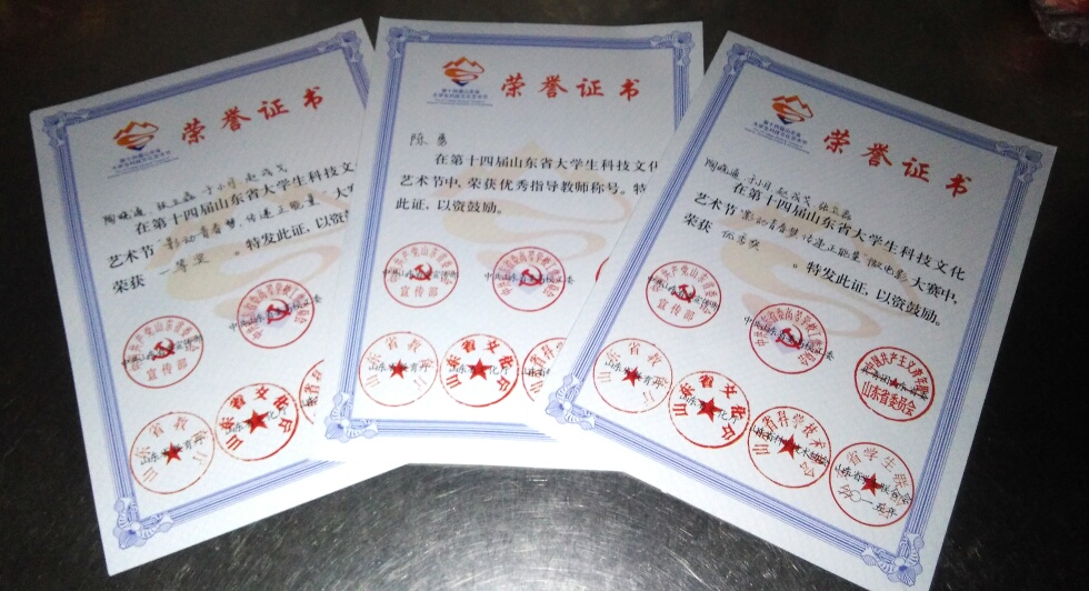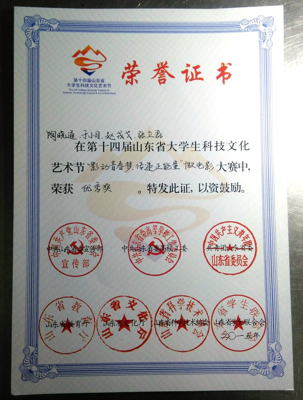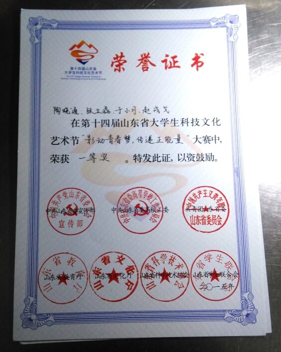 “影动青春梦,传递正能量”微电影大赛是本届大学生科技文化艺术节的重要内容,意在通过“微电影”的创新形式,展现大学生的风采以及对社会生活的全面思考,同时提高学生创新意识,加快推进全省高校校园文化建设。自本次微电影比赛通知下发以后,活动得到了全院学生的积极响应,共收到多部优秀参赛作品。在经过大赛的专业评审后,由陶晓通、张立磊、于小月和赵戎戈四人组成的创作团队,凭借曾斩获校级微电影大赛故事片一等奖的《最佳辩手》和纪录片二等奖的《师大之春》,再次在大学生科技文化节上荣获殊荣,分获优秀奖和一等奖,陈勇荣获优秀指导教师称号。