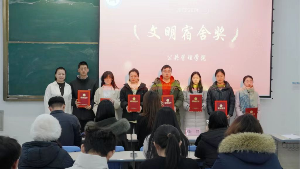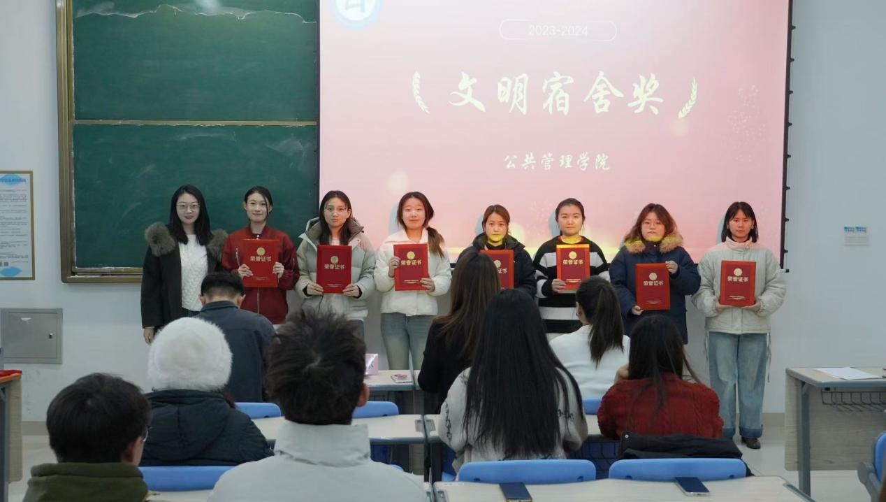 会议伊始,李烨翔首先对上阶段学院宿舍情况进行汇报并宣读此次受表彰的36个文明宿舍名单。张静、孙冰、李晓娜分别为21级、22级、23级文明宿舍颁奖。颁奖仪式结束后,学院优秀宿舍代表郭佳音分享优秀宿舍建设经验,提出明确宿舍内部卫生工作分配、充分利用各种收纳工具、保持自身良好的卫生习惯等建议,以身作则维持宿舍卫生。