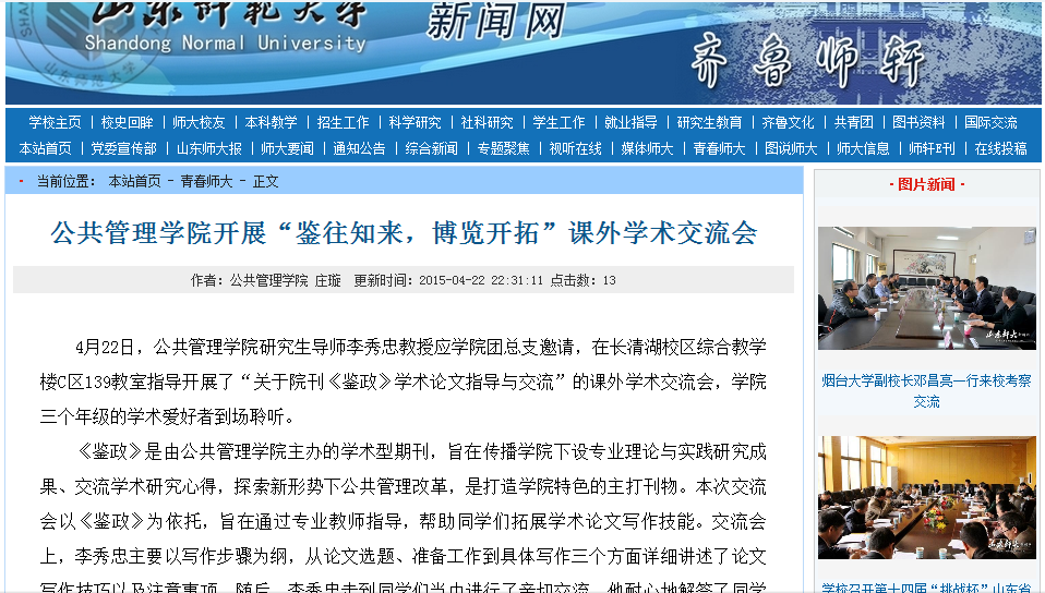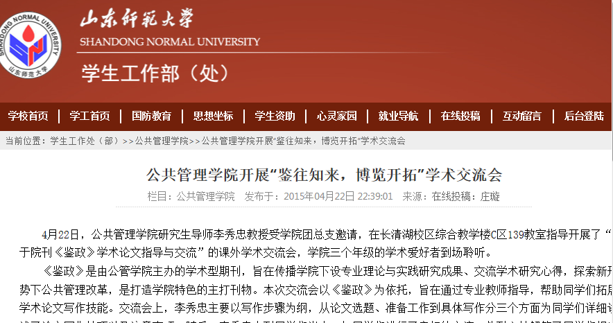 为增强同学们的论文写作技能,使大家接触到学术论文这一领域,为以后更高的学业发展打好基础,4月22日,英国365集团研究生导师李秀忠教授受学院团总支邀请,在长清湖校区综合教学楼C区139教室指导开展了“关于院刊《鉴政》学术论文指导与交流”的课外学术交流会,学院三个年级的学术爱好者到场聆听。