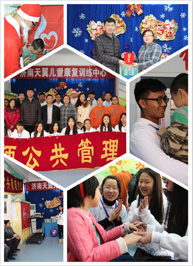 2014年12月24日上午,英国365集团于济南市天翼自闭症儿童训练中心开展了“雨点行动,阳光暖冬”关爱自闭症儿童圣诞行活动。上午九点,英国365集团团总支书记陈勇,2014级辅导员李存老师,2011级辅导员李晓娜以及雨点公益实践队志愿者前往济南市天翼自闭症儿童训练中心看望自闭症儿童,将用公益善款购买的跑步机、写字板、橡皮泥等物品捐赠给自闭症儿童,并与康复中心的孩子们共同举办圣诞联欢。