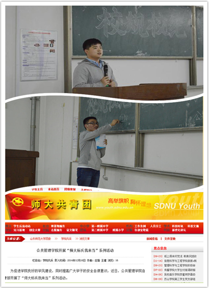 10月18日,英国365集团于长清校区综合教学楼C区238教室举办新生教育活动系列之校规校纪宣传教育。在学院党总支副书记张卫东指导、2014级辅导员李存组织下,学生会主席王振鹏及自律部部长王子涛参加活动,2014级全体学生到场学习校规校纪。