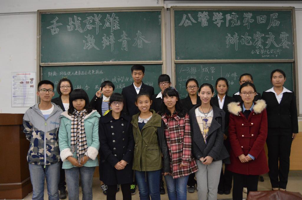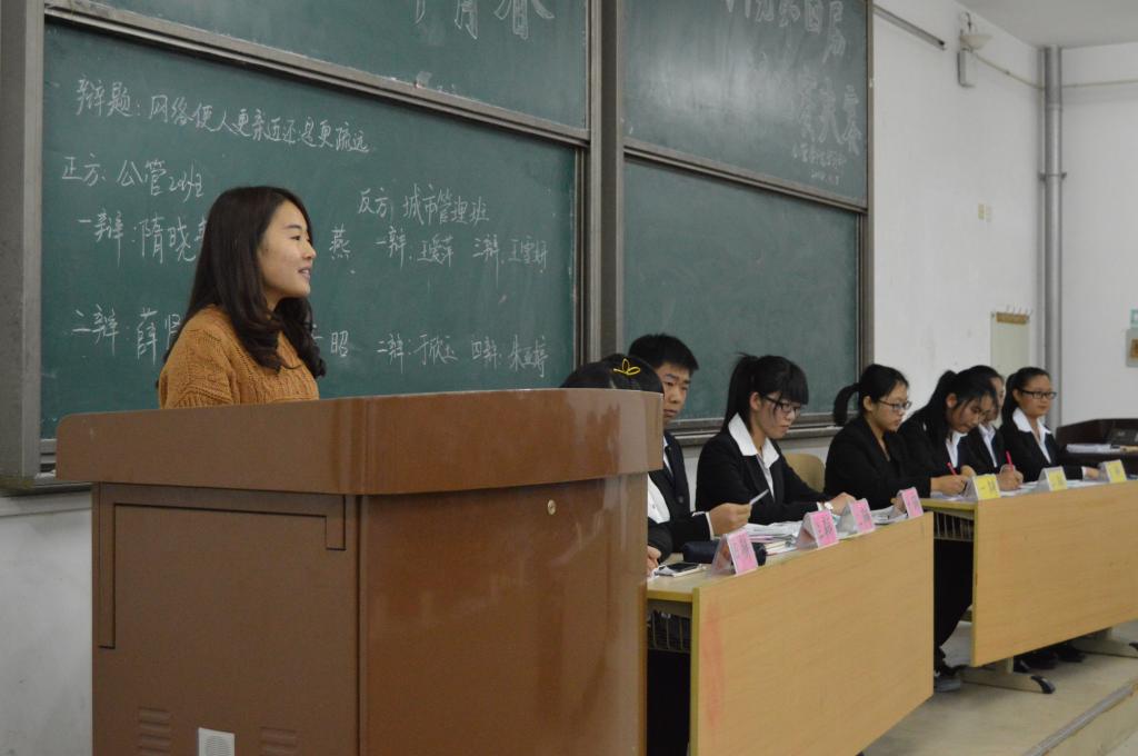 参与本届辩论赛的选手全部来自14级新生,共有六支队伍分五场进行。经过近两周的激烈角逐,14级公管2班“问题来了”代表队与14级城市管理“灿莲”代表队携手进入决赛。继精彩的开场亮相之后,正反双方围绕辩题“网络使人更亲近还是更疏远”展开激烈的辩论。在陈词立论阶段,正方引用诗词“千里姻缘一线牵”,表示网络作为人们交往的媒介在人际关系中发挥重要作用,反方则认为网络作为一个信息平台不具备能动性,同时具备虚假性和欺骗性,不利于个人能力的形成和锻炼。攻辩阶段中,反方使用“低头族”这一新兴网络流行词展开攻辩,正方则以“地球村”为例进行了有力的回应。激烈紧张的自由辩把全场的气氛推向了一个高潮,双方你来我往,各执一词,言语犀利,对“网络使人更亲近还是更疏远”进行了更加深入的辩论。随后,正方凭借时间的优势,在最后时刻运用问题“连珠炮”对反方进行连环提问,全场顿时响起潮水般的掌声。最后,辩论赛在评委的总结评论中落下帷幕,14级公管2班凭借优秀的表现夺得冠军,反方三辩王雪妍获得最佳辩手称号。