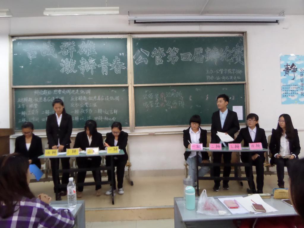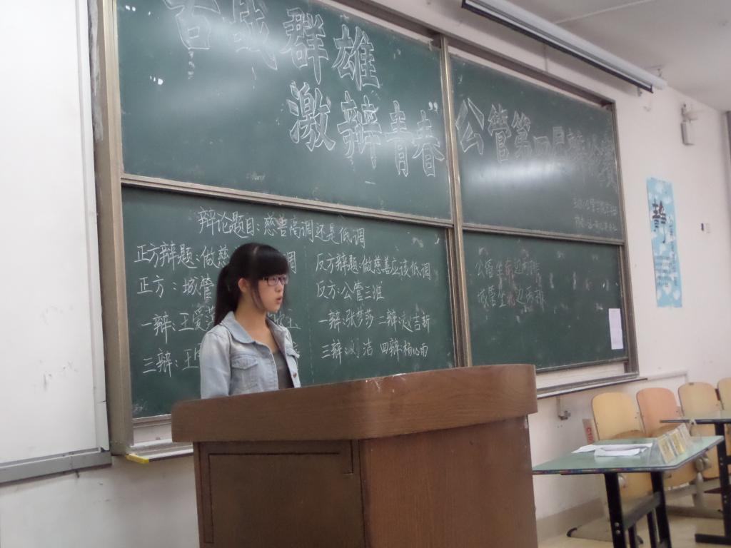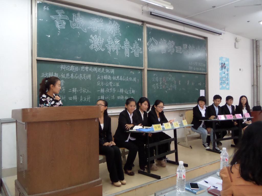 辩论赛现场座无虚席、气氛热烈,首场辩论的烽火在2014级城市管理代表队和2014级公管三班代表队之间燃起。继正反双方慷慨激昂而又具有特色的自我介绍后,围绕辩题“慈善应该高调还是低调”展开了一番激烈的唇枪舌战。正方观点认为“做慈善应该高调”,首先从字面定义上对辩题作出了解释,举出高调扬善的多方优势。反方则支持“做慈善应该低调”,并举出多个例子进行陈词立论。在攻辩环节,现场气氛迅速升温。正方认为高调的慈善会扩大慈善的影响力,引起更高的社会关注度,从而唤起全社会做慈善的意识。反方则以“陈光标事件”加以反驳,正方也毫不示弱、紧追猛攻,接着用“逸夫楼”为例佐证观点。在激烈紧张的自由辩论环节,双方更是争锋相对、步步紧逼。反方表示“做好事不留名”是中华民族的传统美德,“微尘”从青岛的一对夫妇到现如今的志愿者群体是大家的“低调追随”。正方表示,个人的力量过于单薄,“微尘”之所以有众人的追随,也是得益于广泛的社会影响。双方紧抓对方漏洞,不断回击,精彩表现赢得了全场的连声叫好与热烈掌声。本次辩论赛在双方的总结陈词中结束,张琪的点评更是画龙点睛。最终,正方2014级城市管理代表队获得首场辩论赛胜利,反方三辩刘洁获得最佳辩手的荣誉称号。