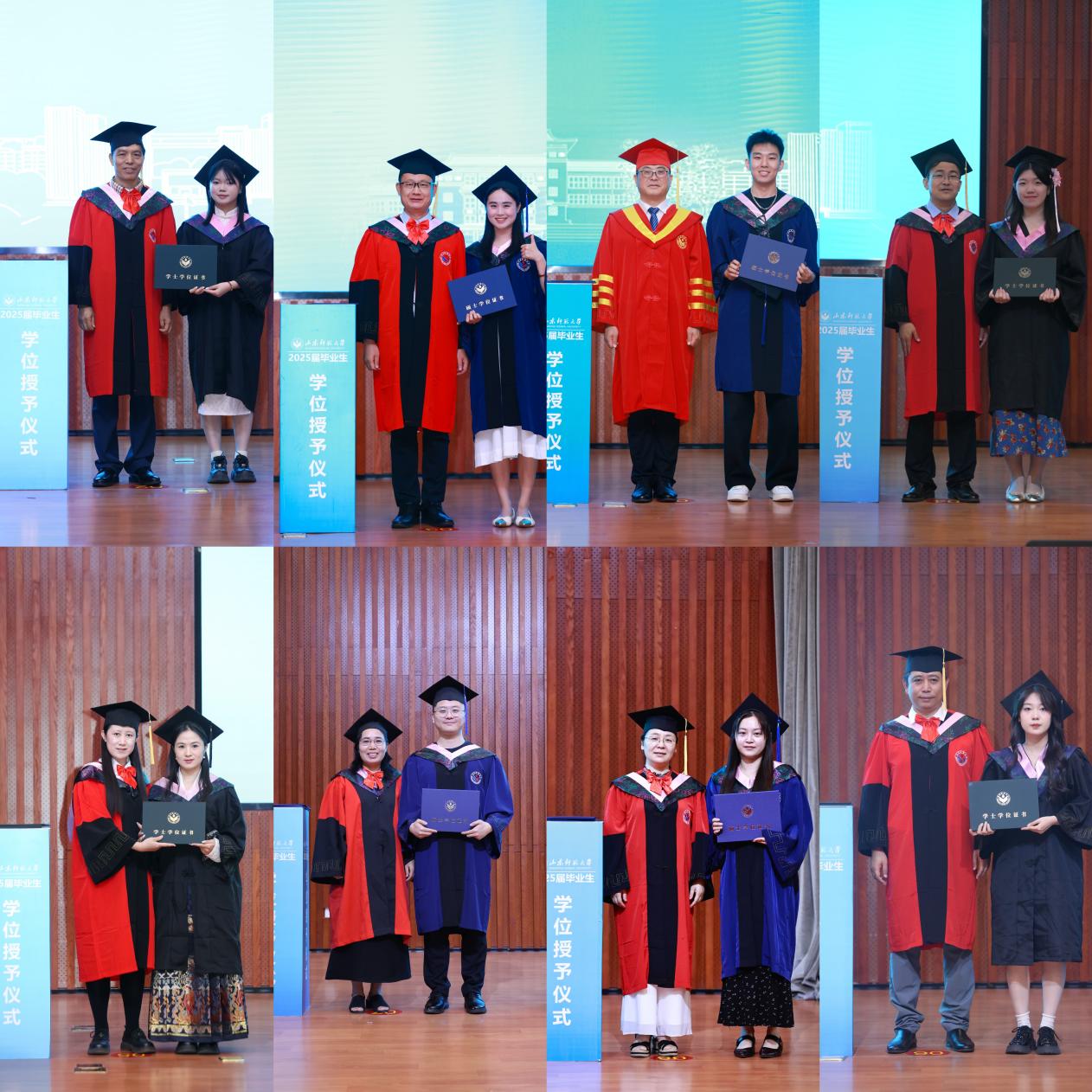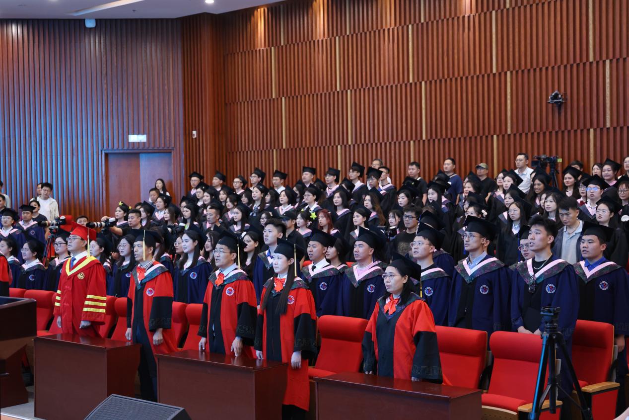 在雄壮激昂的国歌声中,学位授予仪式正式开始。校长张建及各位领导、老师共同为获得硕士和学士学位的毕业生逐一拨穗正冠、颁发学位证书,并与每位毕业生亲切握手、合影留念。