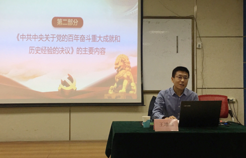 王增福院长以《在新的赶考路上创造新的辉煌》为题,从十九届六中全会召开的背景、《中共中央关于党的百年奋斗重大成就和历史经验的决议》的主要内容、《决议》中的新论断新表达和十九届六中全会精神的重大意义四个方面进行了深入阐述。他认为本次全会是党在国内国际形势发生深刻变化的背景下、在两个一百年交汇的重要关键节点召开的一次具有重大历史意义的会议,面对世界百年未有之大变局,十九届六中全会的召开正当其时,十分必要。