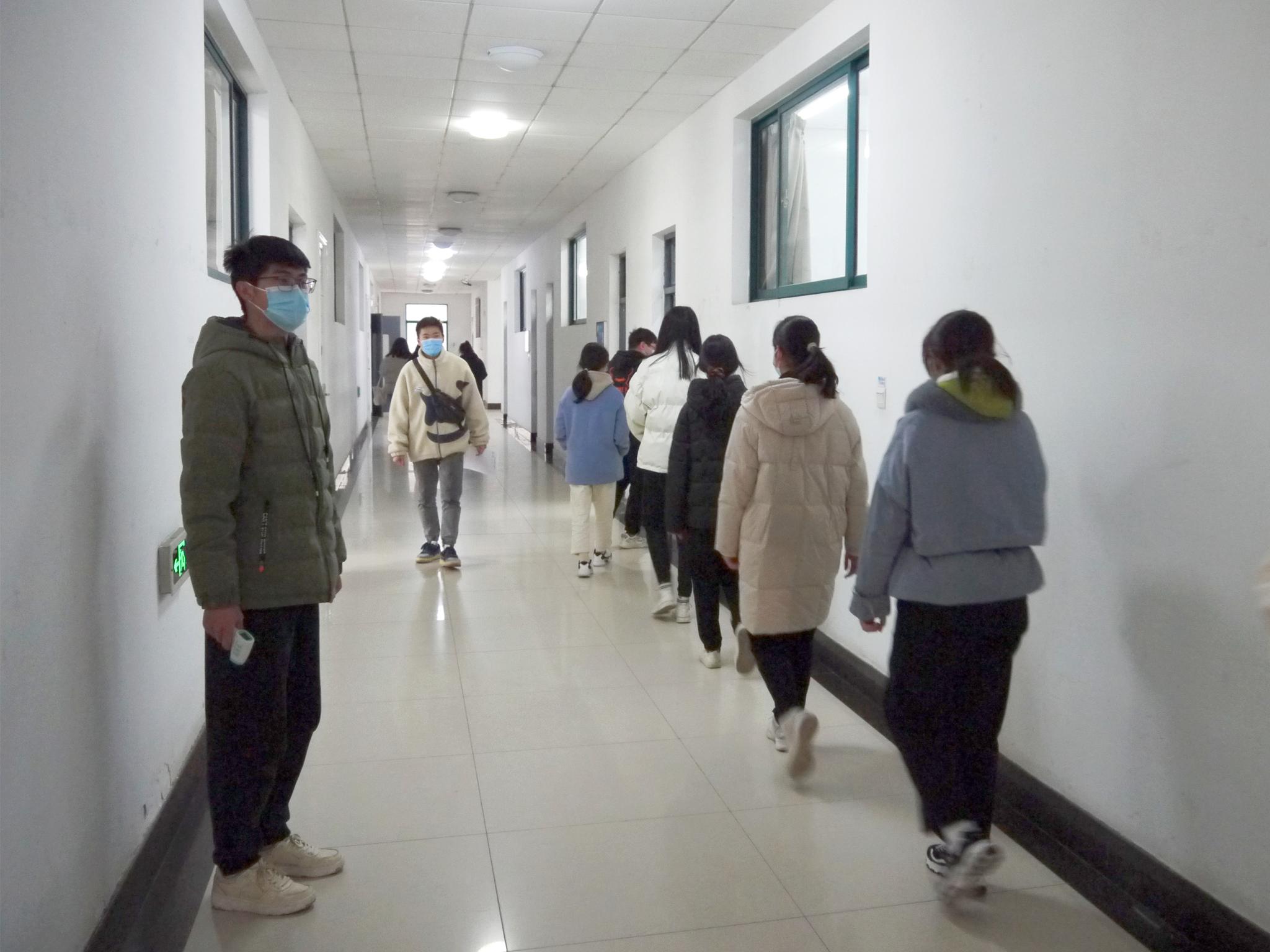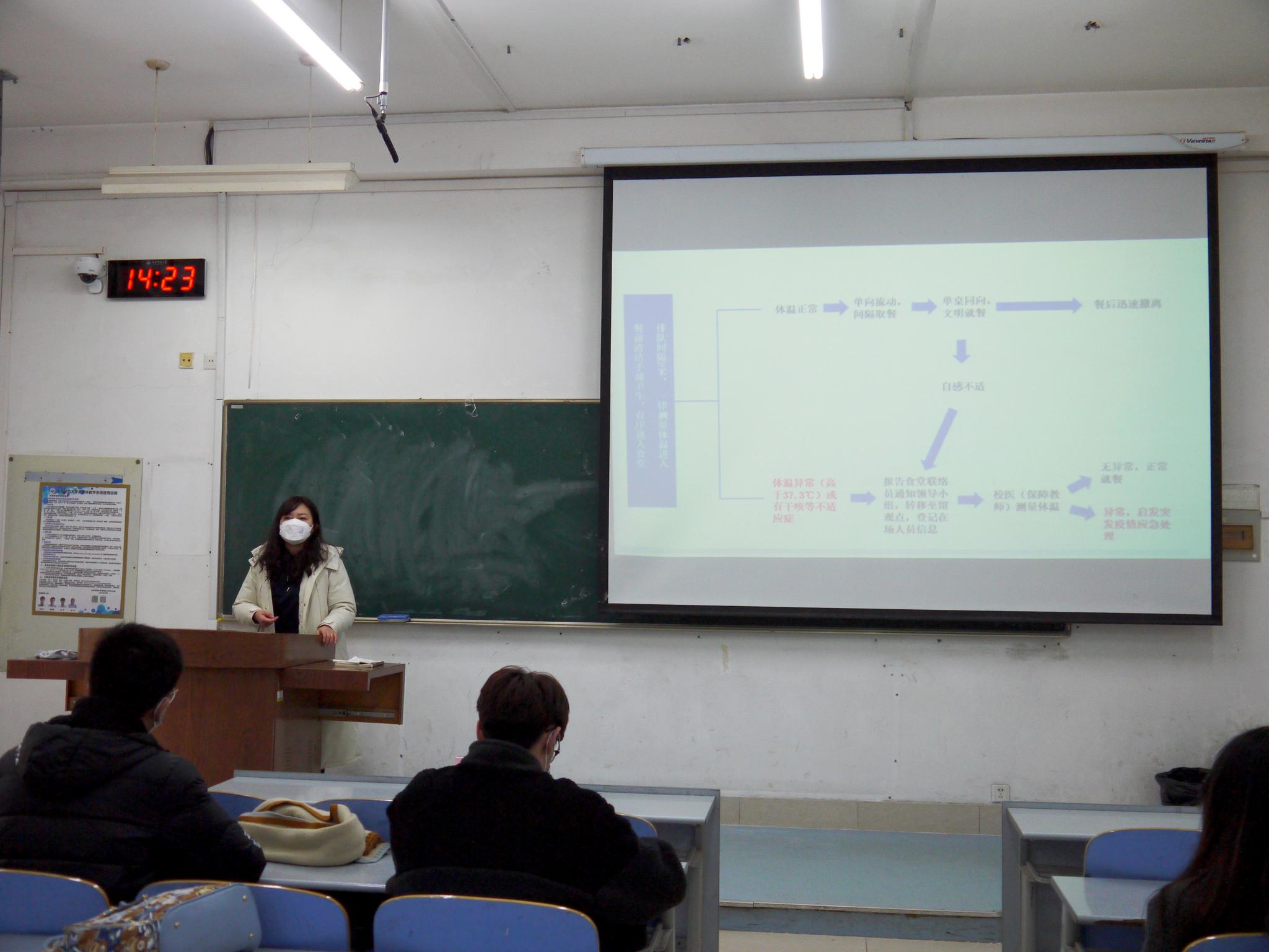 会议伊始,吕科栋阐述了开展此次疫情防控应急演练和培训的重要性与必要性,简单介绍了在不同场景下疫情防控演练的流程。随后,张静引导学生开展演练。本次演练分别模拟了学生在餐厅、教室以及宿舍三种情景下自感不适或发热的场景,针对三种不同情景的特殊性,学生根据疫情防控应急预案进行演练,演练全程环节紧凑,分工清晰明确,安排有条不紊,过程高效有序,演练任务顺利完成。