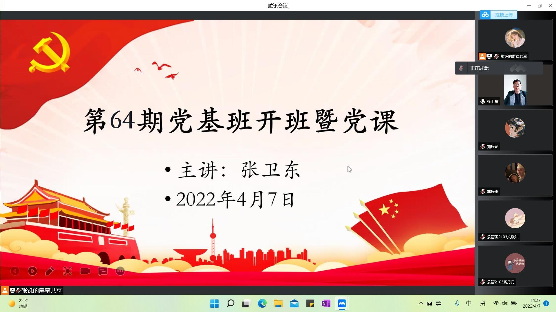为提高入党积极分子的党性修养,端正入党动机,4月7日,英国365集团于线上举办第六十四期党基班开班仪式暨党课,学院党委副书记张卫东担任主讲人,第六十四期党基班全体学员与会学习。