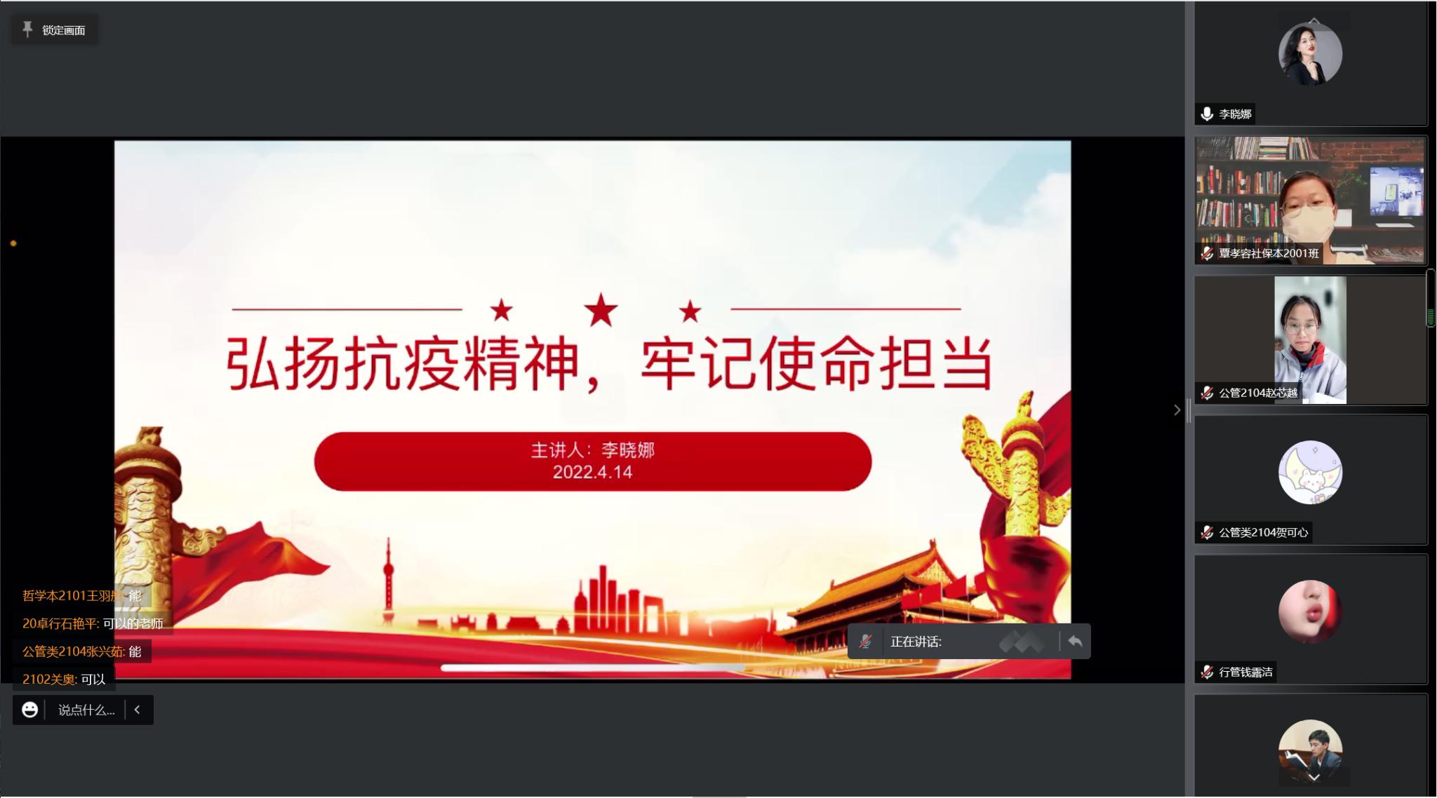 4月14日,英国365集团于线上开展第六十四期党基班“弘扬抗疫精神,牢记使命担当”专题党课,学院学生第一党支部书记李晓娜担任主讲人,第六十四期党基班全体学员积极与会学习。