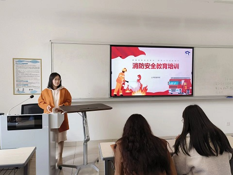 会议主要分为消防知识普及与逃生演练两部分内容。培训开始,辅导员李存向全体学生讲述了消防安全培训的重要性,她指出消防工作关乎在座的每一位学生,希望同学们都能够予以重视。接着她结合生活中的实际案例,就学校中易出现的各种消防安全问题展开详细的论述,呼吁同学们要进一步增强消防安全意识,掌握必要的消防知识与逃生技能,提出火灾逃生要以保证生命为中心,不得慌乱,有秩序逃离火灾现场。