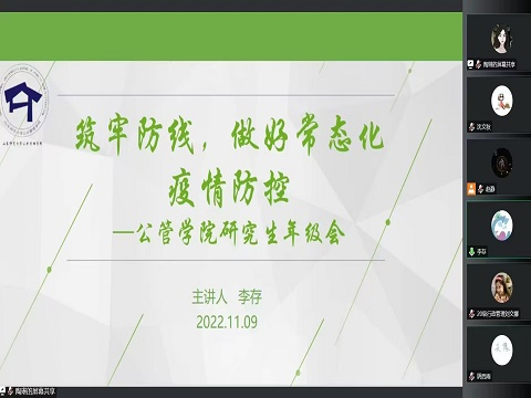 最后李存老师表示,当前疫情形势依然严峻复杂,同学们要积极配合学校学院离校请假、返校隔离、核酸检测等日常防疫工作,进一步提高疫情防控意识,加强纪律观念、筑牢思想防线。