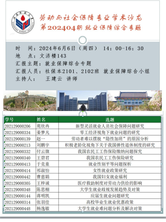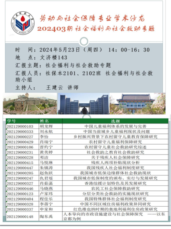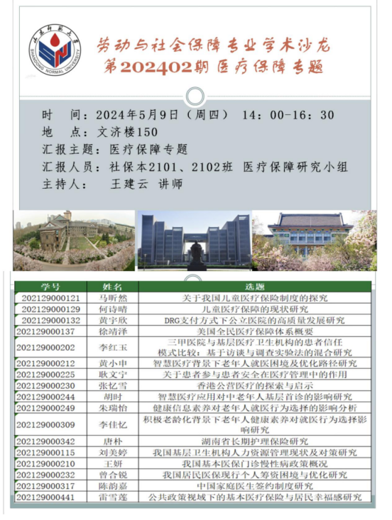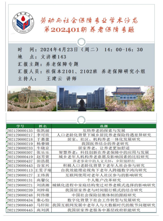 在前期主题凝练、文献述评和社会调研基础上,各位同学已形成了自己的学术观点和研究成果。现向老师和同学汇报研究成果,诚邀大家参会,围绕社会保障热点问题进行研讨,分享真知灼见。