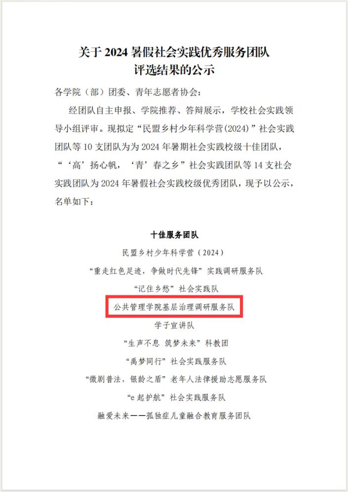 近日,学院“基层治理调研服务队”暑期社会实践取得显著成果,在学校 2024 暑假社会实践优秀服务团队评选活动中脱颖而出,荣获“十佳服务团队”称号。