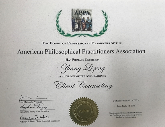 张利增获得美国哲学咨询者学会颁发的哲学咨询师证书