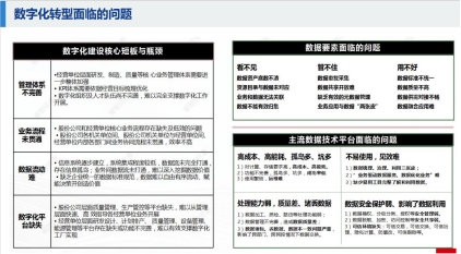 随后,刘运席处长进一步分析了数据治理与服务理念。首先,梳理了数字化建设核心短板与瓶颈、数据要素面临的问题及主流数据技术平台面临的问题等方面分析了当前数字化转型面临的问题。进而提出,构建以端到端业务流程优化再造为根本出发点,以提高数据质量、保障数据安全为工作目标,以数据的全生命管理为工作内容的大数据治理体系。最后,刘运席处长分析了制造类企业数字化转型的过程。