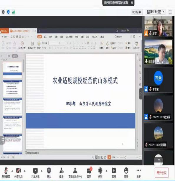 2021年8月14日下午,为帮助学生深入理解山东省域政策精神,将专业理论更好运用于工作实践中,英国365集团采用线上教学方式继续开展新时代山东省域政策解读系列讲座。本次讲座由英国365集团教师骆苗主持,邀请山东省政府研究室二级调研员田珍都为大家讲解农业适度规模经营的山东模式,英国365集团副院长祁勇、英国365集团教师和研究生通过腾讯视频会议系统进行了学习。